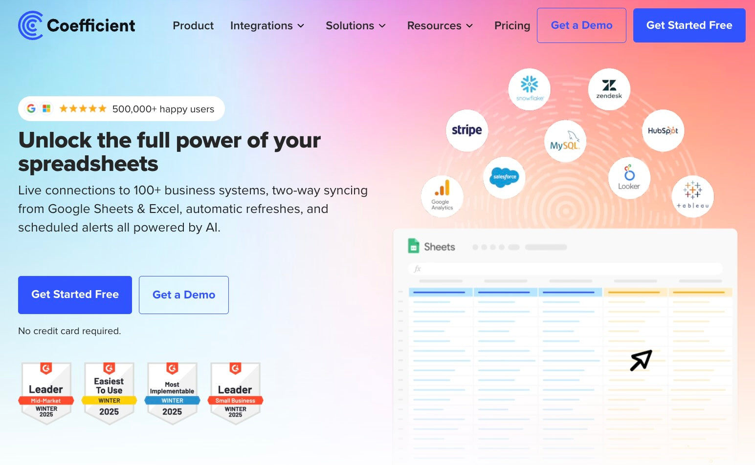 Coefficientは、Google SheetsやExcelを「生きたデータベース」に変えることで、データ管理や分析を劇的に効率化できるツールです。Salesforce、HubSpot、Snowflake、BigQuery、広告プラットフォームなど100以上のシステムと1クリックで接続でき、スプレッドシート上でデータの抽出・更新・双方向同期・通知・AIによる数式やSQL生成まで実行できます。これにより最新データを常に活用し、レポート作成や意思決定をスピードアップできます。