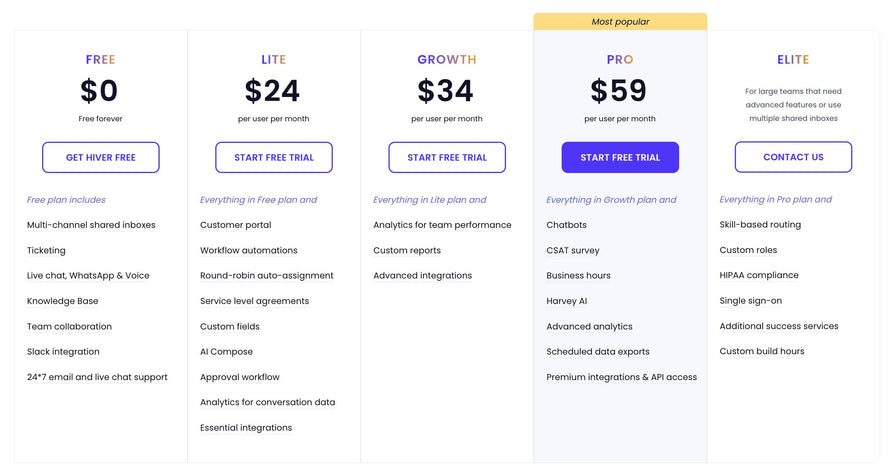 - メール、チャット、WhatsApp、電話、ライブチャットなど、複数のチャネルの問い合わせをHiverの統合プラットフォームで一元管理。