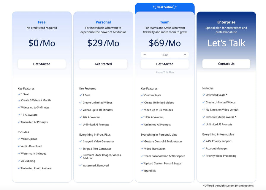 AI Studiosは、文章を入力するだけで本格的な動画を自動で作成できる、オールインワンのAI動画生成プラットフォームです。150種類以上のリアルなAIアバター、80以上の言語に対応した音声合成、用途別テンプレート、リアルタイム会話機能などを備え、ビジネスから教育、サポート業務まであらゆるシーンで活用できます。
