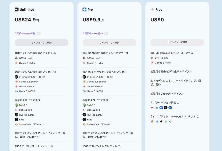 - OpenAIのGPT-4o、Claude 3.5、Gemini 1.5など、複数の高度なAIモデルを統合