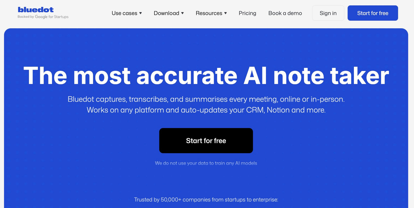 Bluedotは、オンライン会議・対面・電話の会話を録音し、文字起こしと要約(決定事項/ToDo/重要ポイント)を自動で作る会議メモツールです。Chrome拡張やデスクトップアプリで録音でき、会議にボットを招待する必要がありません。会議後の議事録作成や共有、フォローアップ作成の時間をまとめて減らせます。